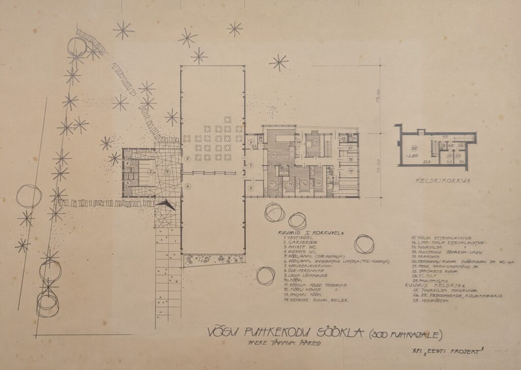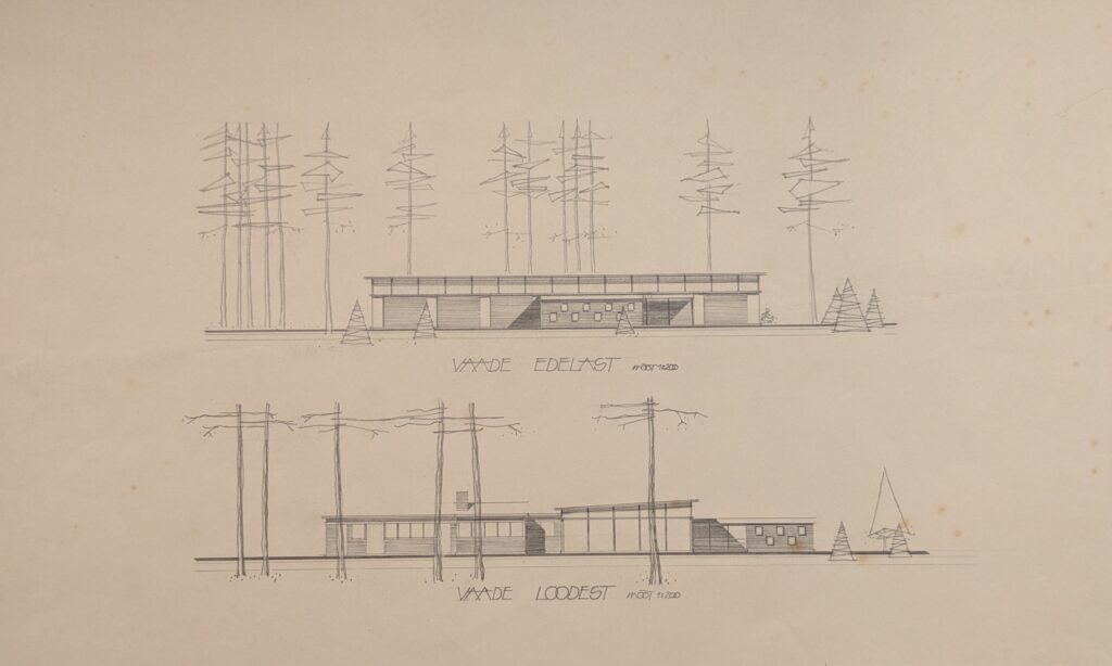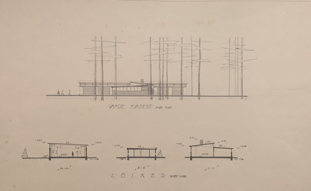 The Canteen of the Võsu Vacation Centre is one of the projects designed by Heili Volberg-Raig (then Härmson) as a long-time architect at the office of Eesti Projekt. She was helped by Lennart Sasi who was responsible for its engineering solutions. The canteen was in great demand in the popular Võsu summer resort, considering that the number of visitors could reach over 11,000 by the end of the season. At that time, Võsu Puhkekodu (Võsu Vacation Centre) was involved in the construction of several buildings necessary for the holiday. The new canteen was erected under the pine trees on the territory of the former Arnold Leihberg summer house, which is adjacent to the Võsu beach.