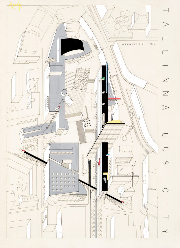 Widely discussed plans for an opera house in the historic Süda-Tatari Quarter in Tallinn in the 1980s gave cause for a new planning competition. Its purpose was to determine once and for all whether an opera house would fit the area. There were no significant restrictions established for the competition. Most architects as well as the authors of this particular competition entry primarily envisaged new buildings being erected to replace old ones. There were plans to preserve part of the landscaping, including a ginkgo tree which was under dispute at the time. This entry “Azalp” which placed 3rd in the competition would have seen the construction of a 21-storey hotel and several novel cultural institutions in the area. This drawing made in acrylic on plastic film was donated to the museum in 1993 by Andres Siim. Text: Sandra Mälk