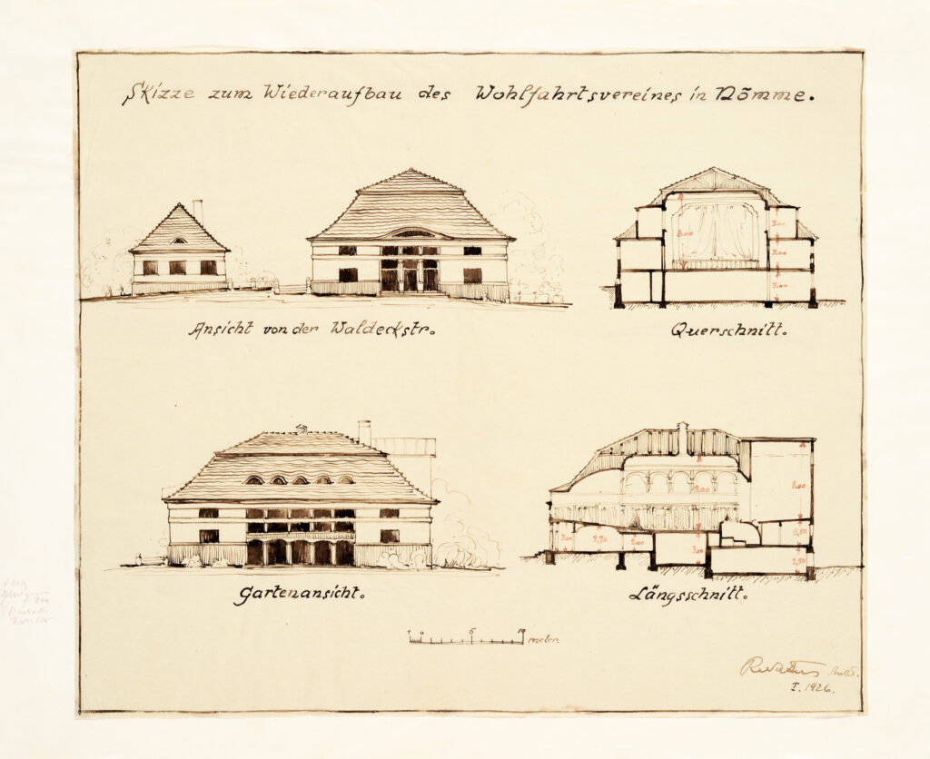 The Nõmme Property Maintenance Association had a strong community effect and played an important part in Nõmme receiving town privileges in 1926. The association (founded in 1908), which brought together local entrepreneurs and house owners, was constantly growing and therefore needed to reconstruct its building located on Õie Street. The extension with a spacious assembly room was made by the soon-to-be city architect Robert Natus. The sketches shown here illustrate the first stage of the project. In 1994, Mart Kalm handed over the archive of Robert Natus to the museum. From this collection of drawings and documents, personal fund no. 17 was created, which includes 80 items. It contains many projects related to Nõmme, such as the design of the Nõmme market building. Text: Sandra Mälk