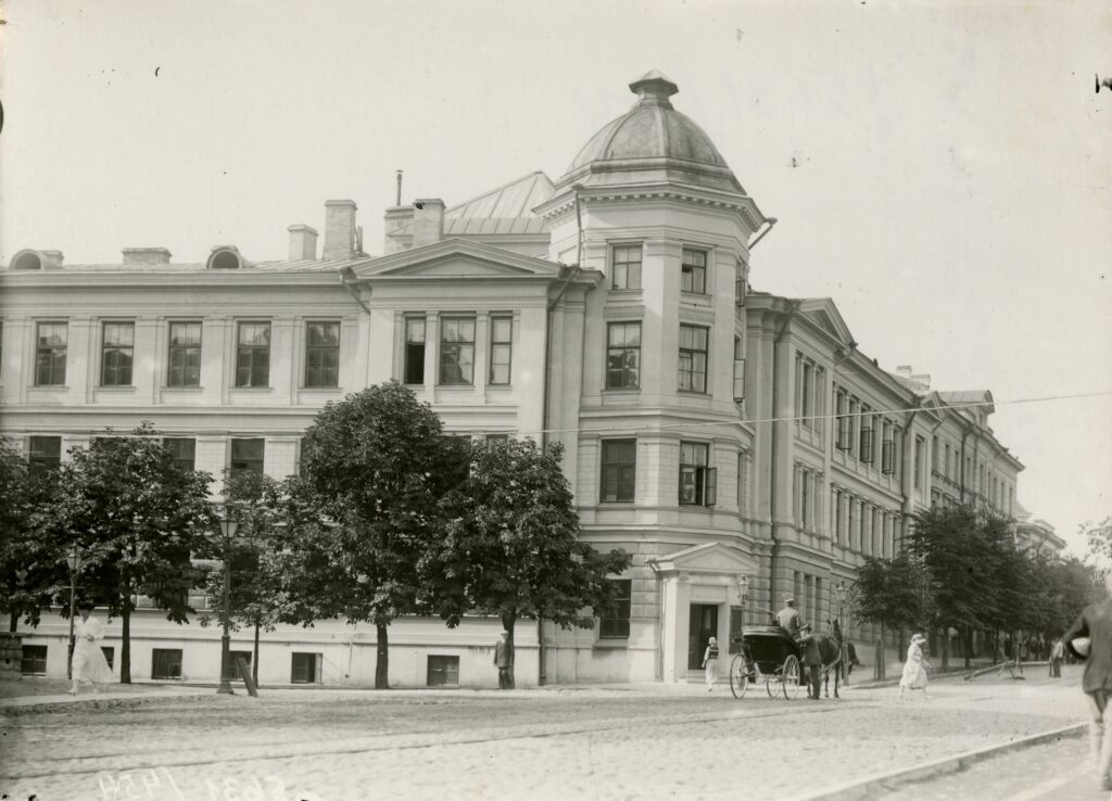 Ringkonnakohus pöördus 19. sajandi lõpus Eestimaa Kubermangu arhitekti Erwin Bernhardi poole, et too projekteeriks riigiasutusele oma hoone Tallinna südalinna Pärnu mnt äärde. Bernhardi nägemuses tuli nii silmapaistvas asukohas olevale hoonele efektne nurgalahendus projekteerida. Neorenessanss-stiilis hoone sissepääsu rõhutav nurgatorn lahendati ülalt valgustusega. Kohtumaja valmis 1893. aastal ja ehituslikult oli üsna haruldane selle esimese korruse ulatuses tahumata kivipinda jäljendav krohviviimistlus. Arvestades, et toona läks praeguse naabri, uhke Draamateatri võistluse ja selle ehituseni veel üle 10 aasta, oli kohtuhoone vanalinna külje all suurejoonelisim ehitis piirkonnas. Foto on tehtud ilmselt 1920. aastate keskpaigas. Hoones tegutseb siiamaani kohtuasutus. Foto lisandus muuseumi kollektsiooni 1996. aastal. Tekst: Sandra Mälk