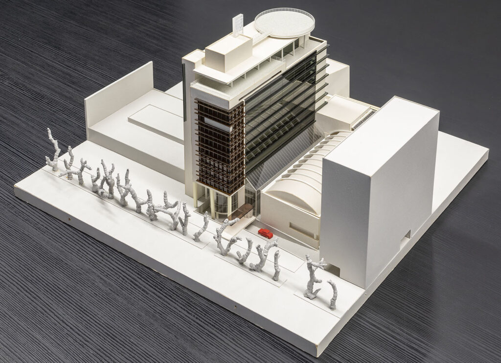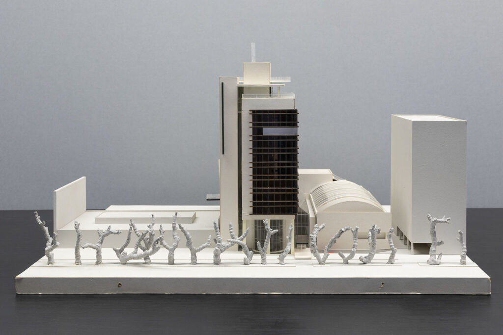 Pärnu maanteele endise aktsiaselts Kalev territooriumile kavandasid arhitektid Andres Alver ja Tiit Trummal 1991. aastal ärikeskuse. Aktsiaseltsile Leverex kavandatud büroohoone projekti iseloomustab selge vormigeomeetria, liigendatud fassaad ja äriarhitektuuri justkui lahutamatuks osaks kujunenud suur klaasist seinapind hoone ühel küljel. Isemoodi vimkana mõjub kõrghoone hoovipool asuva madala hooneosa otsa paigutatud nihkes hoonemaht. Ärihoone alumistele korrusele kavandati esindusruumid, kahe auditooriumiga konverentsikeskus, kohvikud ja baarid. Neljas kuni kümnes korrus planeeriti büroopindadeks, järgnevale korrusele konverentsiruumid ja saunad koos restoraniga. Viimasele, kaheteistkümnendale korrusele kavandati ruumika väliterrassiga restoran. Hoone katusele planeeriti rajada helikopterite maandumisplats. Ärihoone kõrvale kavandati teraskaarfermidele toetuva silinderkatusega kaubanduskeskus koos näidiste halliga. Leverexi ärihoone on ajastutruu näide 1990. aastate esimeses pooles kavandatud, kuid ehitamata jäänud projektist. Maketi annetas muuseumile arhitekt Andres Alver 2016. aastal. Tekst: Anna-Liiza Izbaš