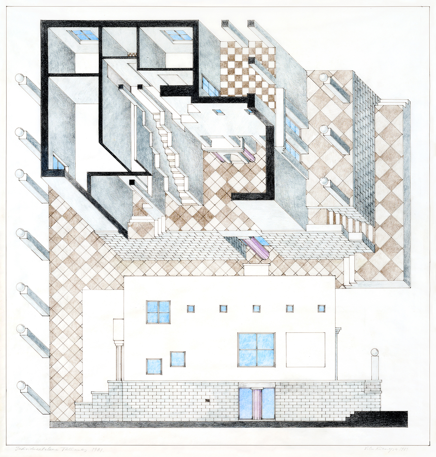 The reason architects from the Tallinn School were fond of axonometric projection is that such drawings are object-centred. Unlike the viewerspecific perspective, this viewpoint places emphasis on the relations of the object with its different parts, i.e. the measurements of floors and walls and the distance between such elements. This leads to a different perception of space – stairs that have been divided at the top and disappear into the unknown and multilayered patterned rooms. This is proof that axonometrical drawings can be used to convey complicated spatial structures. The coloured pencil drawing was donated to the museum by Vilen Künnapu in 2005. Text: Sandra Mälk