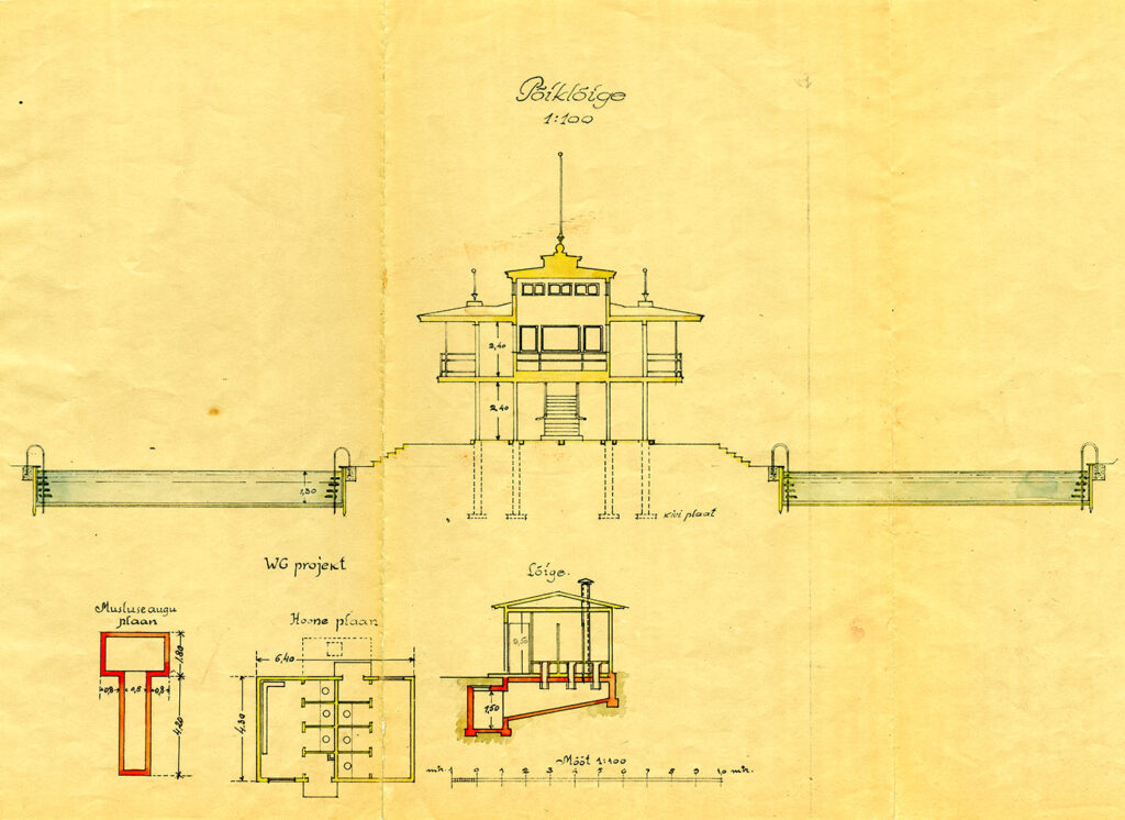 Under the lead of entrepreneur Johan Must, a bathing facility was built in Nõmme under the slope of Mustamäe. The town of Nõmme granted a construction permit for the facility in 1927, but the construction work was delayed due to land ownership disputes. In 1934, Johan Must acquired the necessary land. He received a loan from the Ministry of Economy to build a bathing facility, construction work began in the fall of 1935. Mustamäe bathing facility was designed by architect Tõnis Mihkelson. In 1936, a cafe building and a 50-meter swimming pool were completed. A year later, changing rooms, another slightly deeper pool, a water jumping tower and a swan pond were opened. In order to obtain a water temperature suitable for swimming, cold spring water was directed through four pre-heating pools, and artificial waterfalls were built to ensure water quality. A functionalist wooden cafe building was located between the two swimming pools. There were dressing rooms on the first floor, a balcony and a separate area for the orchestra on the second floor. In addition, a staircase was planned on the slope of Mustamäe, which led to Nõmme’s garden city. Domestic and international swimming competitions were held in the swimming pools, chess tournaments were regularly held in the cafe building. In winter, people could enjoy winter swimming and ice skating.The cafe building of the Mustamäe bathing facility was destroyed in 1974. Text: Anna-Liiza Izbaš