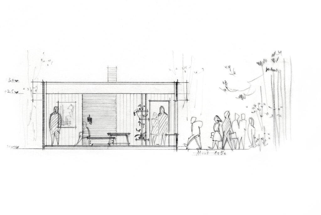 The pavilion is located close to the Latvian border in Pärnu County in Nigula Nature Reserve, which was established in 1957. Ethel Brafmann, a young and promising landscape architect at the time, made the design for the pavilion on the territory of the nature reserve. The purpose of the pavilion is to allow travellers to rest and prepare food while in the middle of a display dedicated to the nature reserve. The wooden pavilion is equipped with a stove and consists of a single 27 m2 room, a kitchen and a small hall with windows with shutters. The drawings originated from the collections that were donated to the museum at 2006 by Inga Tõnissar. Text: Sandra Mälk